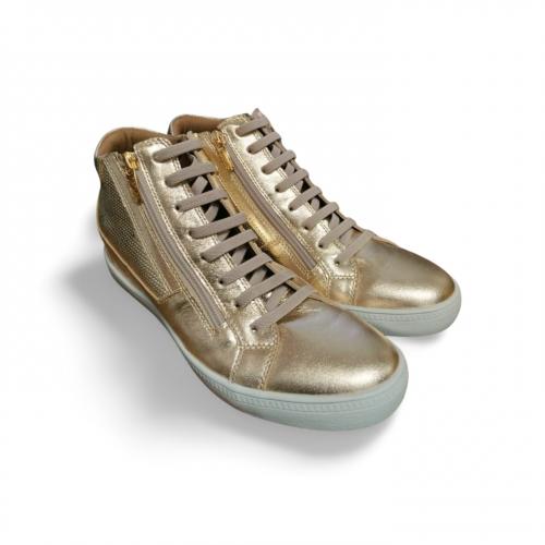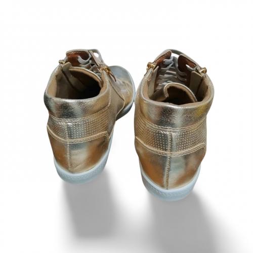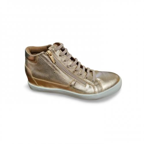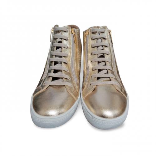 Tênis de cano alto em couro na cor ouro light, com design moderno e sofisticado, garantindo conforto e estilo em qualquer ocasião.
